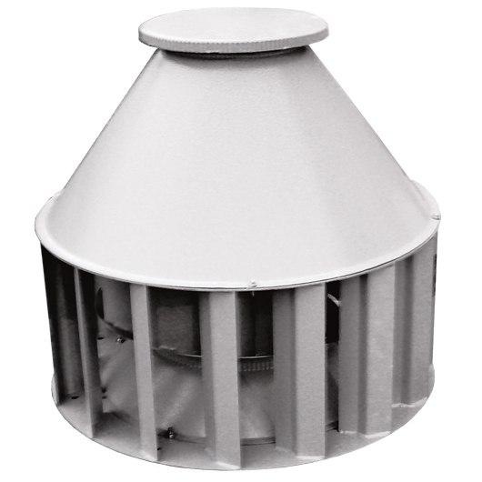 Вытяжные вентиляторы для кровли изготавливаются в виде моноблока в общепромышленном, коррозионностойком и (или) взрывозащищенном исполнении. Внутри металлического корпуса располагается рабочее колесо с лопатками, отогнутыми в противоположную вращению сторону. Рабочее колесо соединено с вертикально расположенным приводом, который защищен от воздействия атмосферных осадков металлическим кожухом. Для крепления кровельного вентилятора к крыше здания на нижнем фланце предусмотрены отверстия под анкерный крепеж. Расширенная комплектация крышного вентилятора ВКР включает в себя клапан, поддон и стакан (для повышенной защиты оборудования от воздействия атмосферных осадков).